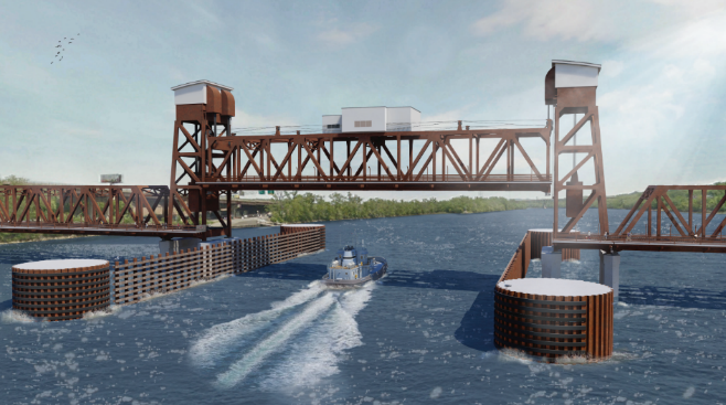 The proposed design is for a two-track vertical lift bridge that will resemble the existing bridge and will include a multi-use path. The existing bridge will be closed and demolished after the new bridge is operational.